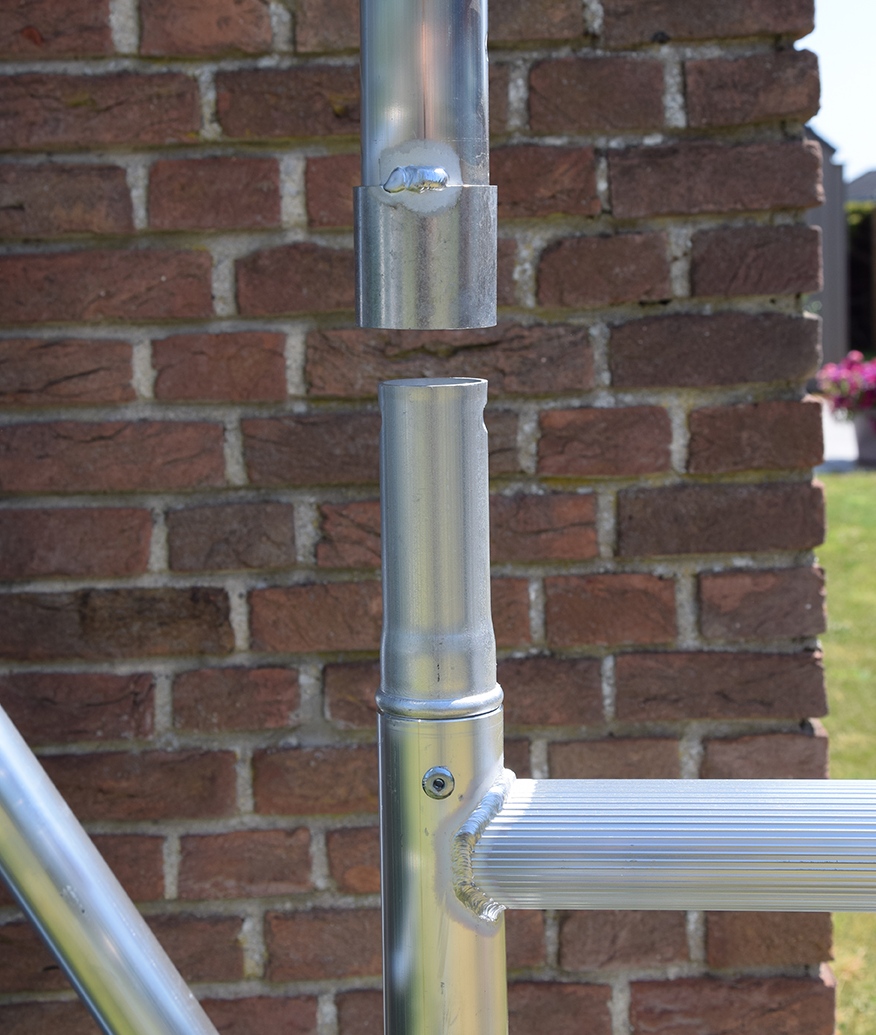 Een opbouwframe is het skelet van jouw steiger, zonder frame kan je dan ook geen vloeren plaatsen. De steigerframes worden verticaal geplaatst en zijn voorzien van ‘sporten’ waaraan je bijvoorbeeld een steigervloer,schoren, of voorloopleuning kan bevestigen. Een universeel opbouwframe betekent dat het frame uitwisselbaar is met de meest gangbare merken. Denk hierbij aan merken zoals Euroscaffold, Alumexx, ASC, Altrex, Wienese en Topway. Let altijd wel op dat je huidge frame een rechte pen heeft, die je kan borgen met borgclips (zie afbeelding hiernaast).